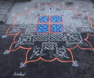 Rangoli is an Indian folk art drawn on the floor with rangoli powders or paste. Rangoli is regionally known as Kolam in Tamilnadu, Muggulu in Andhra Pradesh, and Rangavalli in Karnataka. There are hundreds of rangoli designs in iKolam, created by members from all over the world. Here are the some of the latest rangolis: