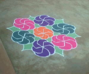 I USED ALMOST ALL THE COLOURS FOR THIS RANGOLI. I LIKED THE LOTUS VERY MUCH ON THE OUTSIDE OF THE BORDER.