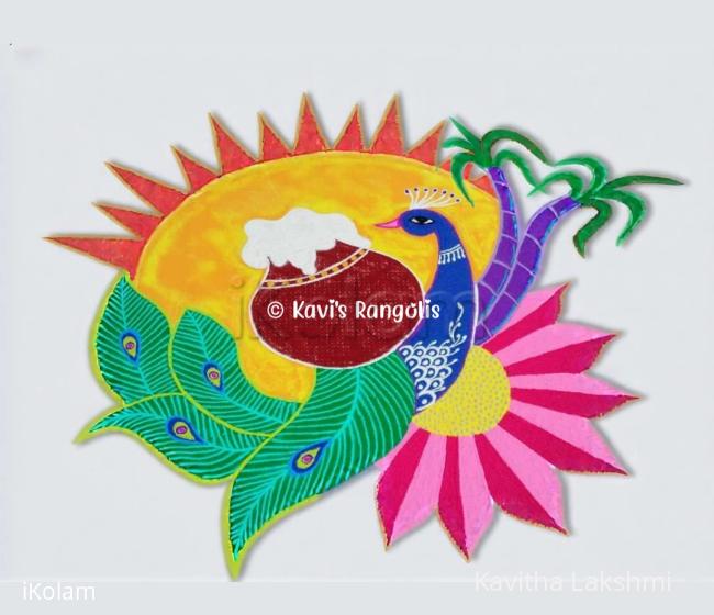 A freehand pongal rangoli with pongal pot,sun, sugarcane,peacock and flowers