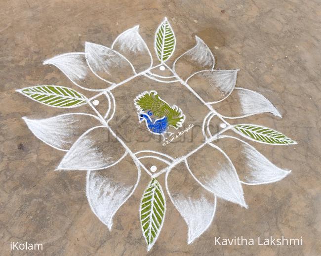 A simple lotus flowers rangoli with peacock inside it for Saraswati Pooja