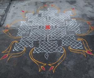 Rangoli is an Indian folk art drawn on the floor with rangoli powders or paste. Rangoli is regionally known as Kolam in Tamilnadu, Muggulu in Andhra Pradesh, and Rangavalli in Karnataka. There are hundreds of rangoli designs in iKolam, created by members from all over the world. Here are the some of the latest rangolis: